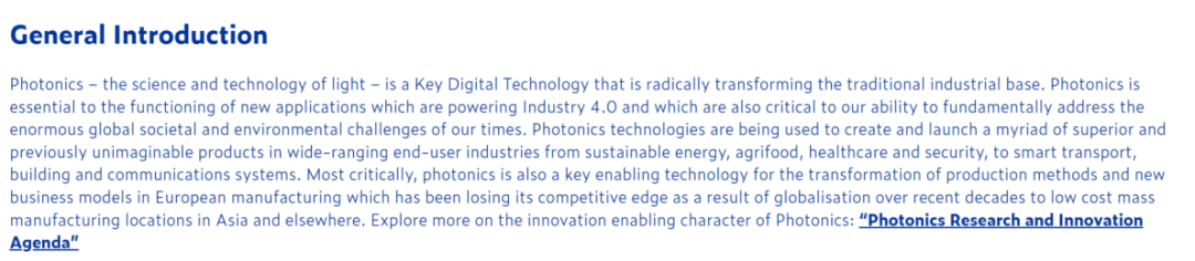 比如,光子學數字創新中心(PhotonHub)已從“地平線2020”科研計劃獲得1900萬歐元的投資。此外,為加快歐洲工業對光子技術的采用和部署,光子學數字創新中心還計劃建立一個單一的光子創新中心,該中心將歐洲53個頂級能力中心的所有一流光子技術、設施、專業知識和經驗整合在一起,作為一站式解決方案,可為歐洲任何想通過光子學進行創新的公司提供開放式訪問。