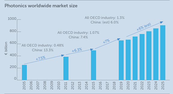光子技術及產業的主要市場集中在北美地區(美、加)、歐洲地區(英、德、法、荷等)和亞太地區(中、日、韓、中國臺灣)。而從2019年的數據來看,中國在光子產業是全球最大的市場,且市場份額有上漲的的趨勢,歐洲和美國則分列二三,市場份額暫未突破20%。當然,這并不意味著全球局勢不會發生變化,畢竟光子技術及其應用仍處在發展初期,各國(企業)都在“拼命”地進行研發與應用。