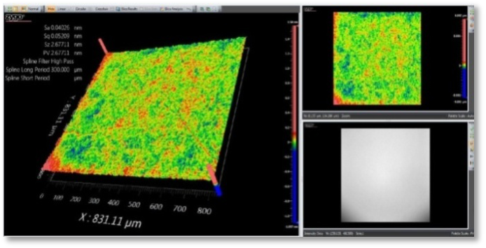 采用特殊的超光滑拋光工藝,白光干涉儀檢測拋光表面粗糙度可低于1埃,100倍顯微鏡下無任何劃痕和點子,表面質量達到0/0。拋光是決定光學元件質量最重要的工藝,極低的表面粗糙度和表面雜質與缺陷可有效提升光學元件的抗強激光損傷能力。
