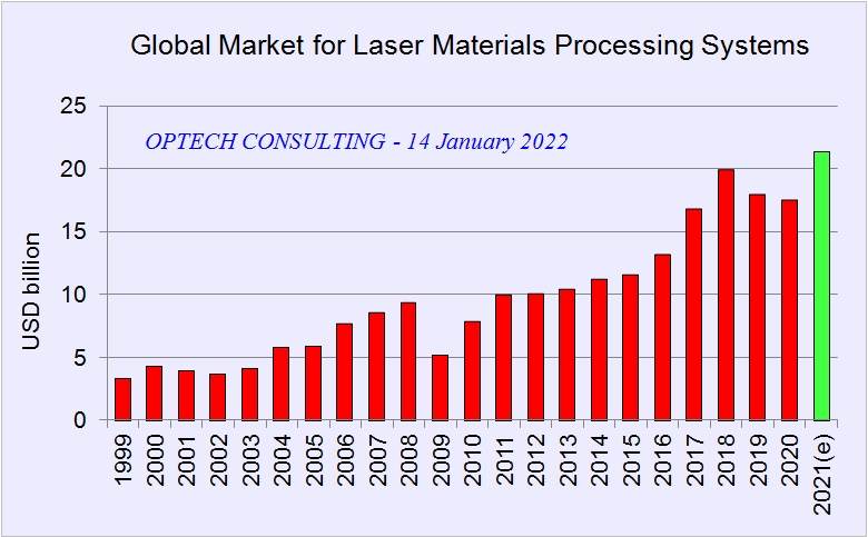 市場研究公司Optech Consulting的一項最新調研報告顯示,去年全球工業(yè)激光系統(tǒng)市場顯示出強勁的增長勢頭?;?021年前三個季度的初步數據顯示,全球工業(yè)激光系統(tǒng)市場規(guī)模達到213億美元,創(chuàng)下歷史新高,較2020年增長了22%。工業(yè)激光源市場在過去一年也創(chuàng)下了52億美元的新紀錄,光纖激光器占比超過50%,而美國IPG 作為光纖激光器的龍頭企業(yè),占據光纖激光器近五成份額。