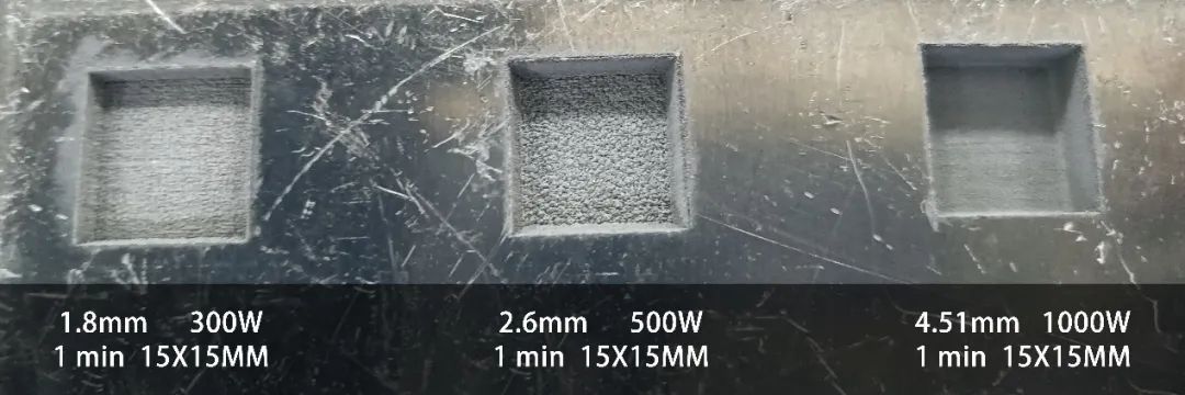 為了粗略測試1000W MOPA激光器,基本性能,我們進行了對比實驗。實驗配置F160焦距的場鏡,在鋁材上進行一分鐘的15mm*15mm面積深雕,分別使用公大激光的300W 、500W 和 1000W MOPA 進行對比測試。分別測試了,采用正焦深雕和Z軸同步移動兩種方式,測試結果見下: