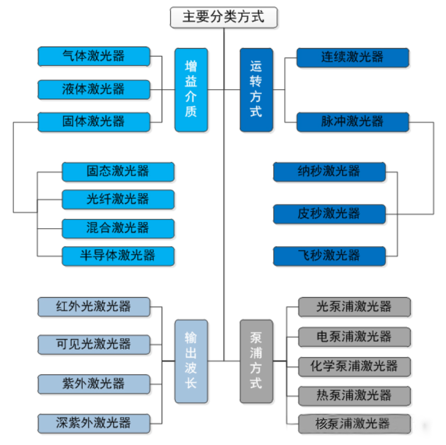 激光器種類繁多,分類標(biāo)準(zhǔn)各異,但以增益介質(zhì)、運(yùn)轉(zhuǎn)方式、泵浦方式和輸出波長(zhǎng)為標(biāo)準(zhǔn)的分類方式 最為常見。