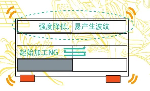 采用復(fù)合機(jī)進(jìn)行鈑金激光切割下料時(shí),機(jī)床夾鉗夾持板材沿X方向和Y方向移動(dòng),制品加工設(shè)備及加工區(qū)域如圖1所示。但隨著加工的不斷進(jìn)行,板材局部應(yīng)力被釋放,強(qiáng)度逐漸減弱,導(dǎo)致板材在運(yùn)動(dòng)過程中產(chǎn)生晃動(dòng),從而產(chǎn)生激光切割波紋,造成加工制品不良。而切割波紋的大小還與制品的加工方向、初始加工位置、制品取出順序等因素有關(guān),不同情況的切割波紋不良現(xiàn)象如圖2、圖3所示。且大尺寸制品由于從板材上切割開后,板材的應(yīng)力釋放會(huì)較大,因此在切割板材剩余部分時(shí),板材隨夾鉗移動(dòng),晃動(dòng)就會(huì)更大,造成切割剩余制品時(shí)產(chǎn)生切割波紋。由于產(chǎn)品尺寸較大、加工時(shí)間較長(zhǎng),因此造成加工費(fèi)用及材料浪費(fèi)較多,所以盡可能保證板材在切割運(yùn)動(dòng)過程中的受力穩(wěn)定及受力強(qiáng)度是切割下料過程中需要重點(diǎn)考慮的問題。