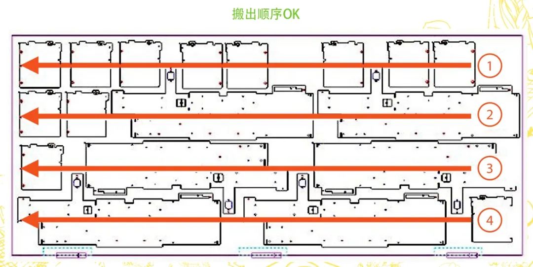 生產(chǎn)過程中,有時(shí)會(huì)使用TK機(jī)械手輔助取出切割完成的制品,這樣能更好地節(jié)約人力物力,實(shí)現(xiàn)設(shè)備的全自動(dòng)化生產(chǎn)。但是在使用TK機(jī)械手取出制品時(shí)需要注意,要控制好制品的取出順序,避免板材因強(qiáng)度減弱、材料晃動(dòng)產(chǎn)生切割波紋。如果先選擇將板材兩端制品取出,再將板材中間的制品取出,這樣就會(huì)造成板材兩端的應(yīng)力被釋放,板材強(qiáng)度不足,當(dāng)加工程序進(jìn)行到板材中間位置時(shí),板材勢(shì)必會(huì)因強(qiáng)度不足而產(chǎn)生晃動(dòng),造成制品的切割波紋,如圖9所示,且產(chǎn)品不良率較高,加工損失較大。如果從遠(yuǎn)離夾鉗一側(cè)將制品依次取出,這樣可以很好地保證加工位置板材應(yīng)力集中,運(yùn)動(dòng)穩(wěn)定,避免產(chǎn)生切割波紋,如圖10所示。因此在加工編程時(shí),要保證被取出的制品從遠(yuǎn)離夾鉗一端依次進(jìn)行,這樣可以很好地保證板材強(qiáng)度,避免板材在運(yùn)動(dòng)過程中因強(qiáng)度不足而產(chǎn)生晃動(dòng),從而避免切割波紋的產(chǎn)生。
