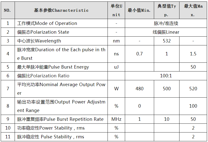 如表1所示,五百瓦單模準連續綠光光纖激光器的指標特性和傳統認知中紅外準連續光纖激光器有較大的差異:此準連續非彼準連續,兩種準連續的激光器除了波長不同以外,產生準連續激光的機制也完全不同,因此無論是從脈沖能量,重復頻率還是脈寬上都有顯著的區別。