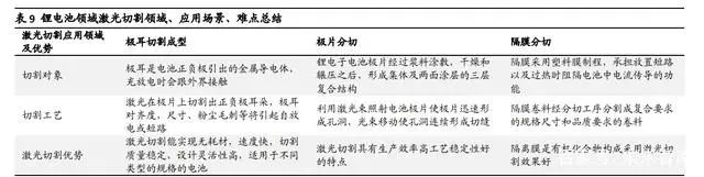 熱影響控制仍是難點,紫外激光存在替代傳統模切可能。根據存能電氣官網信 息,鋰離子電池隔膜 PP 膜與 PE 膜兩者的熔點不同,PE 隔膜在 130℃左右,PP 隔膜 在 160℃左右。根據英諾激光招股說明書,在薄膜非金屬材料加工等領域,高能量 的紫外光子直接破壞非金屬材料表面的分子鍵,使分子脫離物體,這種方式不會產 生高熱量反應,因此通常被稱為“冷加工”,紫外激光機在微加工領域具有不可替代 的優勢。我們判斷,在目前仍是模切為主的隔膜切割環節,由于隔膜較低的熔點導 致激光切割熱影響控制仍是難點,紫外激光以“冷加工”的優勢存在替代傳統模切可 能。