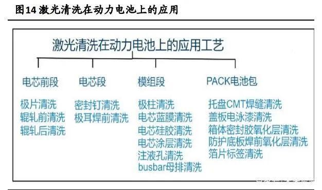 電池焊接前:根據 C114 通信網官網信息,采用脈沖激光直接輻射去污,使其 表面溫度升高而發生熱膨脹,熱膨脹使污染物或者基底振動,從而使污染物克服表 面吸附力脫離基底表面從而達到去除物體表面污漬的目的。這種方式可以有效地去 除電芯極柱端面的污物、粉塵等,為電池焊接提前做準備,以減少焊接的不良品。電池組裝過程中:根據 C114 通信網官網信息,為了防止鋰電池發生安全事故,一般需要對鋰電池電芯進行外貼膠處理,以起到絕緣的作用,防止短路的發生 以及保護線路、防止刮傷。對絕緣板、端板進行激光清洗,清潔電芯表面臟污,粗 化電芯表面,提高貼膠或涂膠的附著力,且清洗后不會產生有害污染物,屬于環保 的綠色清洗方法,這在全球高度關注環保的情況下越發顯出它的重要性。