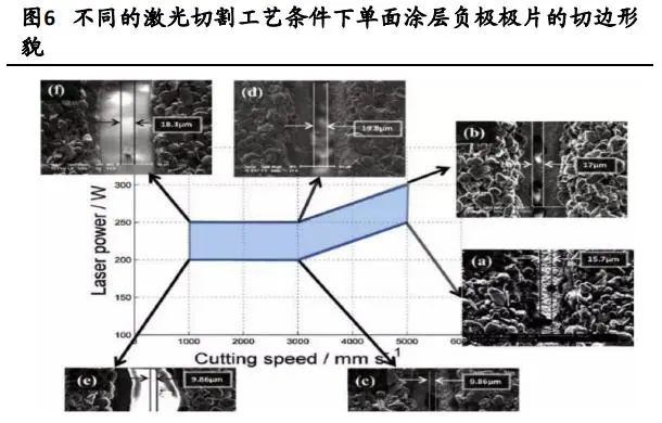 圓盤分切和模切品質量不穩定;激光能量和切割移動速度是兩個主要的工藝參 數。根據動力電池網信息,極片切割有圓盤分切和模切、激光切割三種方式,圓盤 分切和模切都存在刀具磨損問題,這容易引起工藝不穩定,導致極片裁切品質差, 引起電池性能下降;激光能量和切割移動速度是兩個主要的工藝參數,對切割質量 影響巨大。當激光功率太低或者移動速度太快時,極片不能完全切開,而當功率太高或移動速度太低時,激光對材料作用區域變大,切縫尺寸更大。