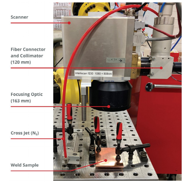 Coherent應用工程師使用 ARM 激光進行了一系列銅焊接測試,該激光具有直徑為 22 μm 的高亮度中心光束和內徑/外徑為 100 μm/170 μm 的環形光束。使用放大倍率為1.4 的遠端加工頭聚焦激光,并使用氮氣作為保護氣體和橫向射流。焊接的材料是純銅。所有測試的激光功率均為 4 kW,中心為 1.5 kW,環形光束為 2.5 kW。照片(圖 2)顯示了實驗裝置。